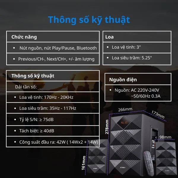- Tổng công suất: 42W RMS (14W x 2 loa vệ tinh + 14W loa siêu trầm)